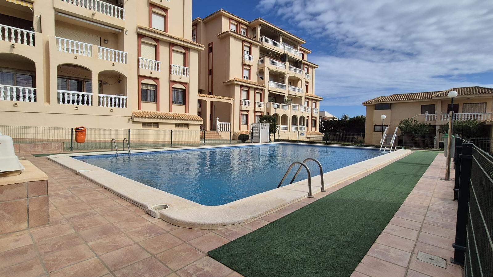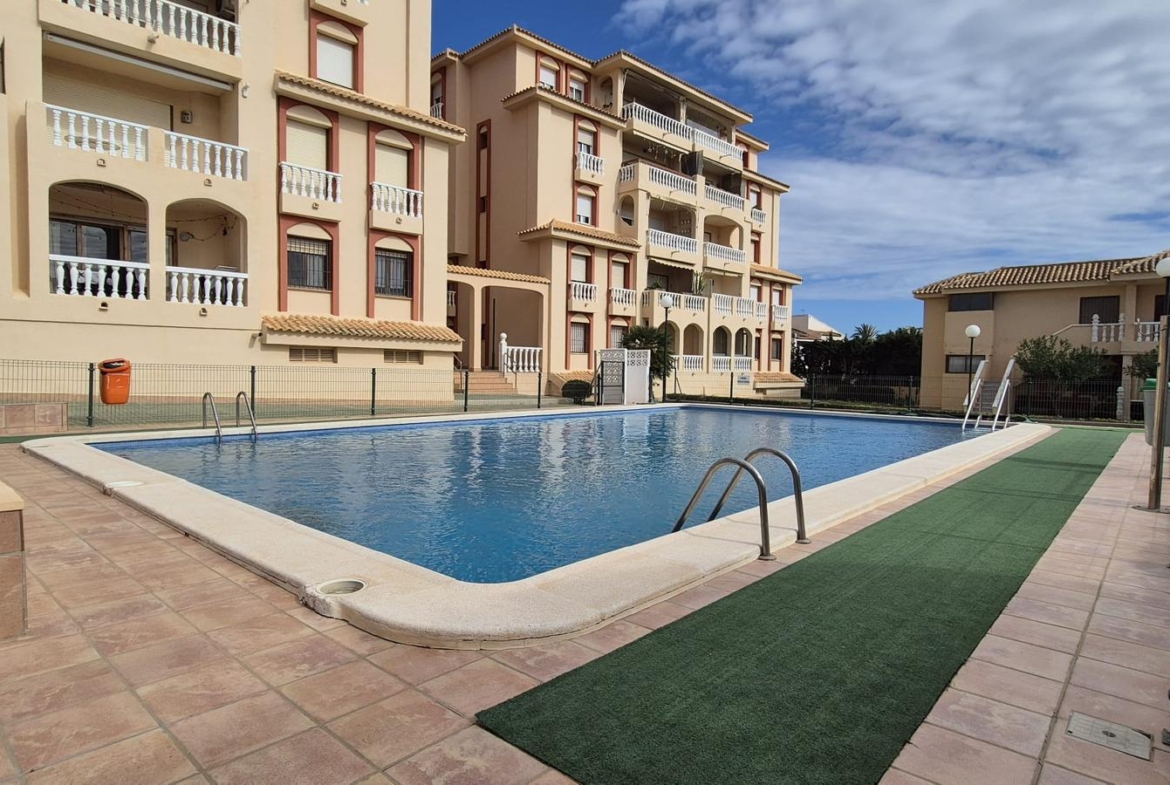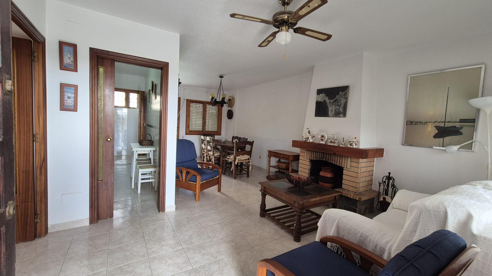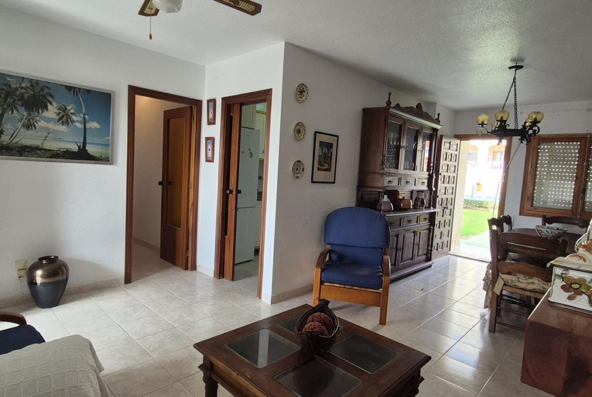 El salón dispone de salida a un agradable porche trasero con vistas a la zona comunitaria y a la piscina, creando un espacio ideal para disfrutar del clima mediterráneo durante todo el año.