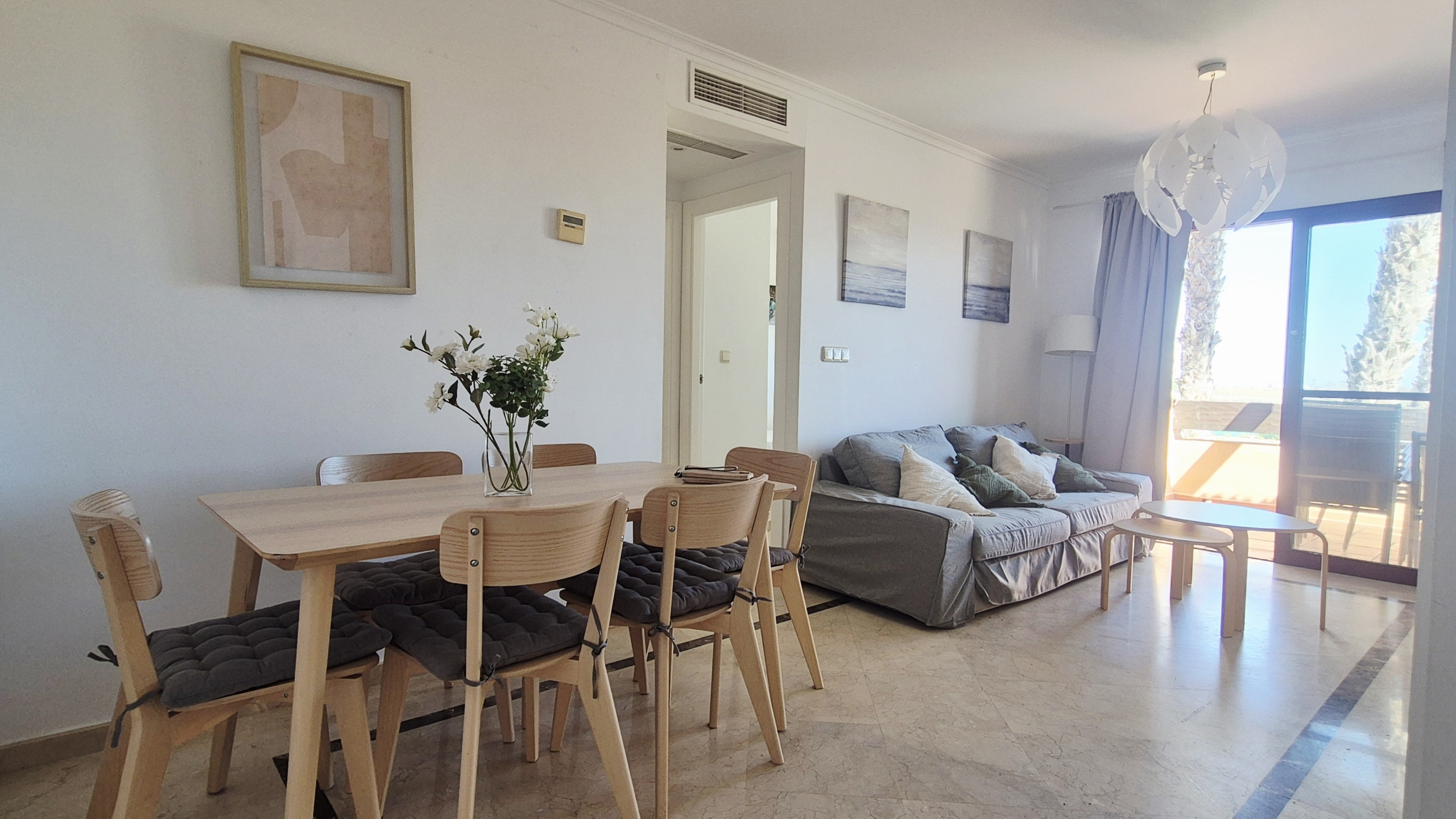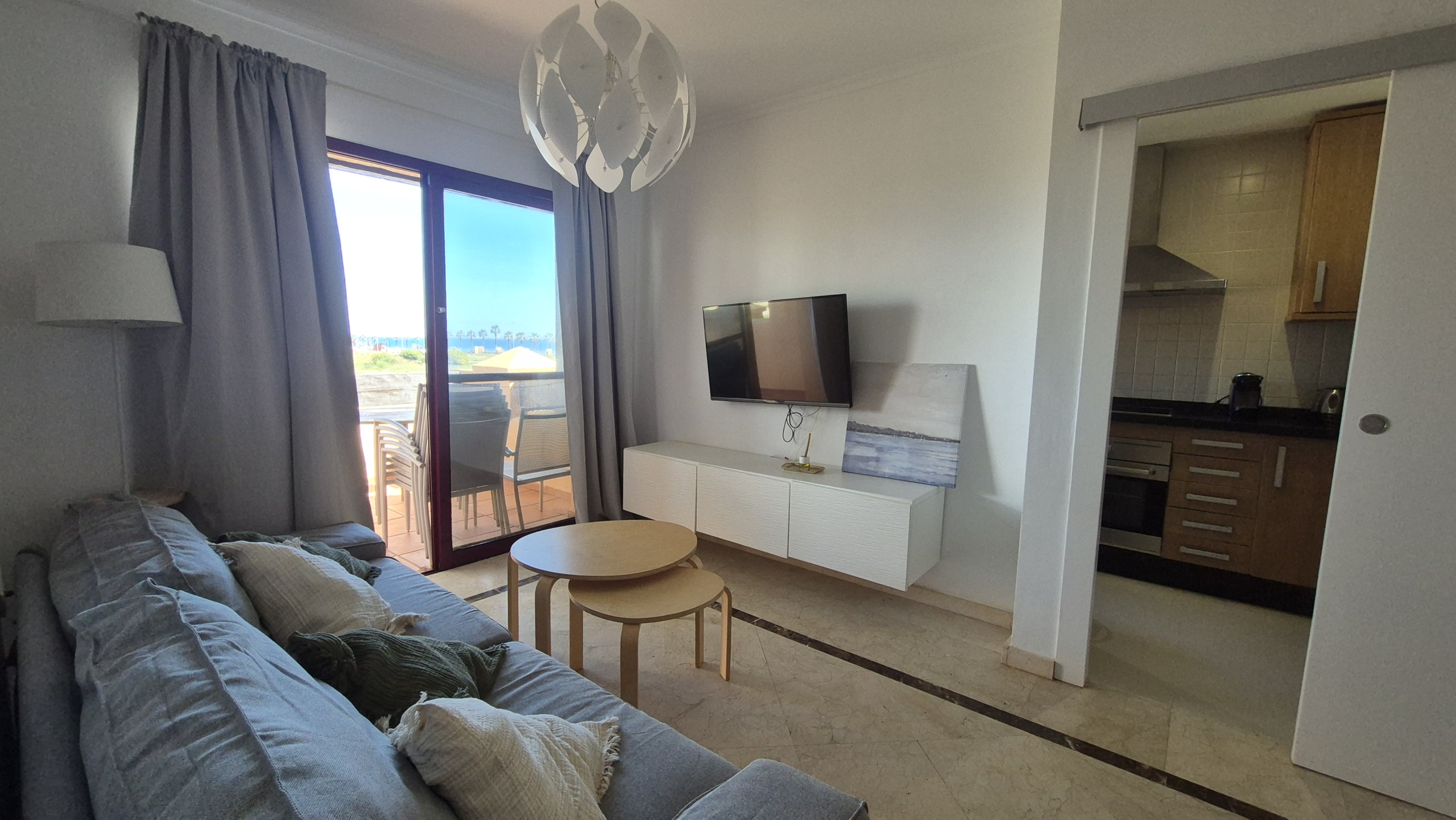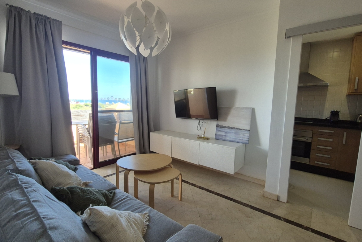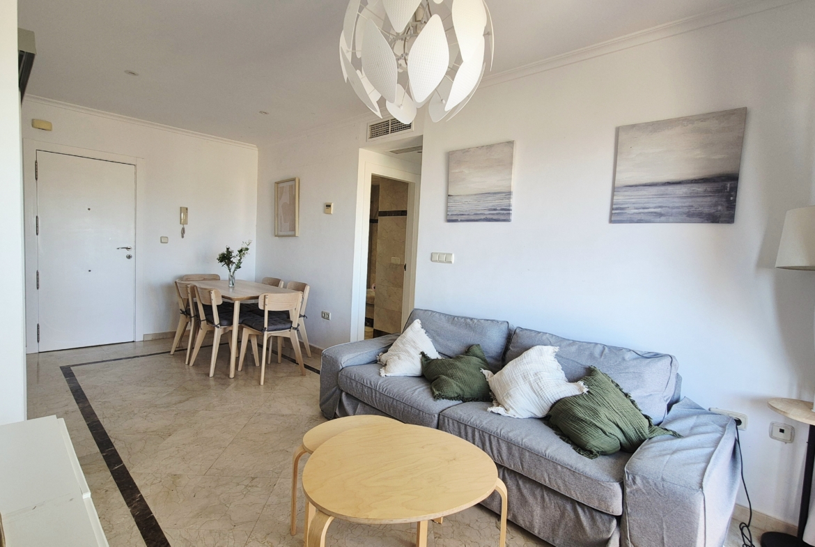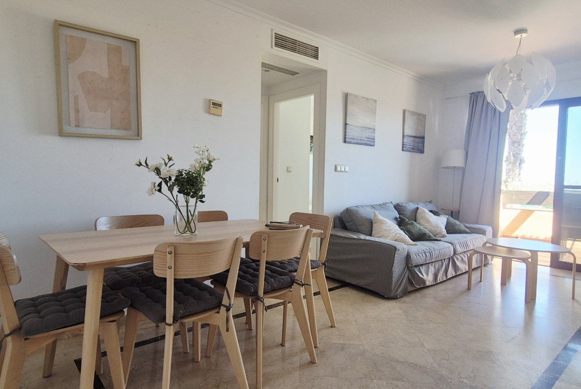 Amplio y muy luminoso salón-comedor con salida directa a un gran balcón con vistas al mar, perfecto para desayunar, relajarse o disfrutar de las noches de verano con la brisa marina.