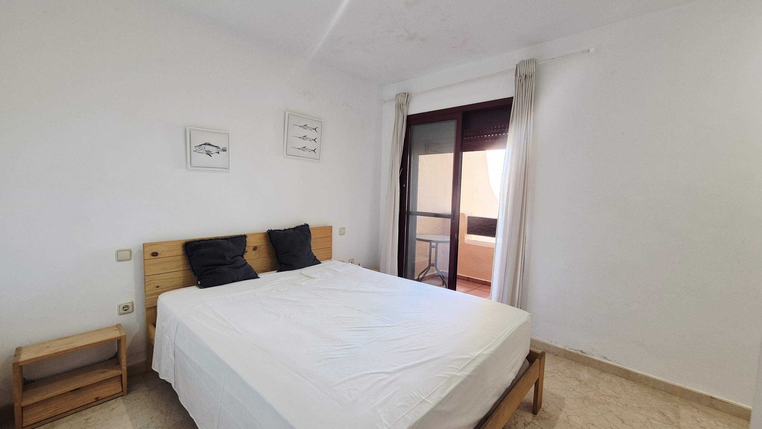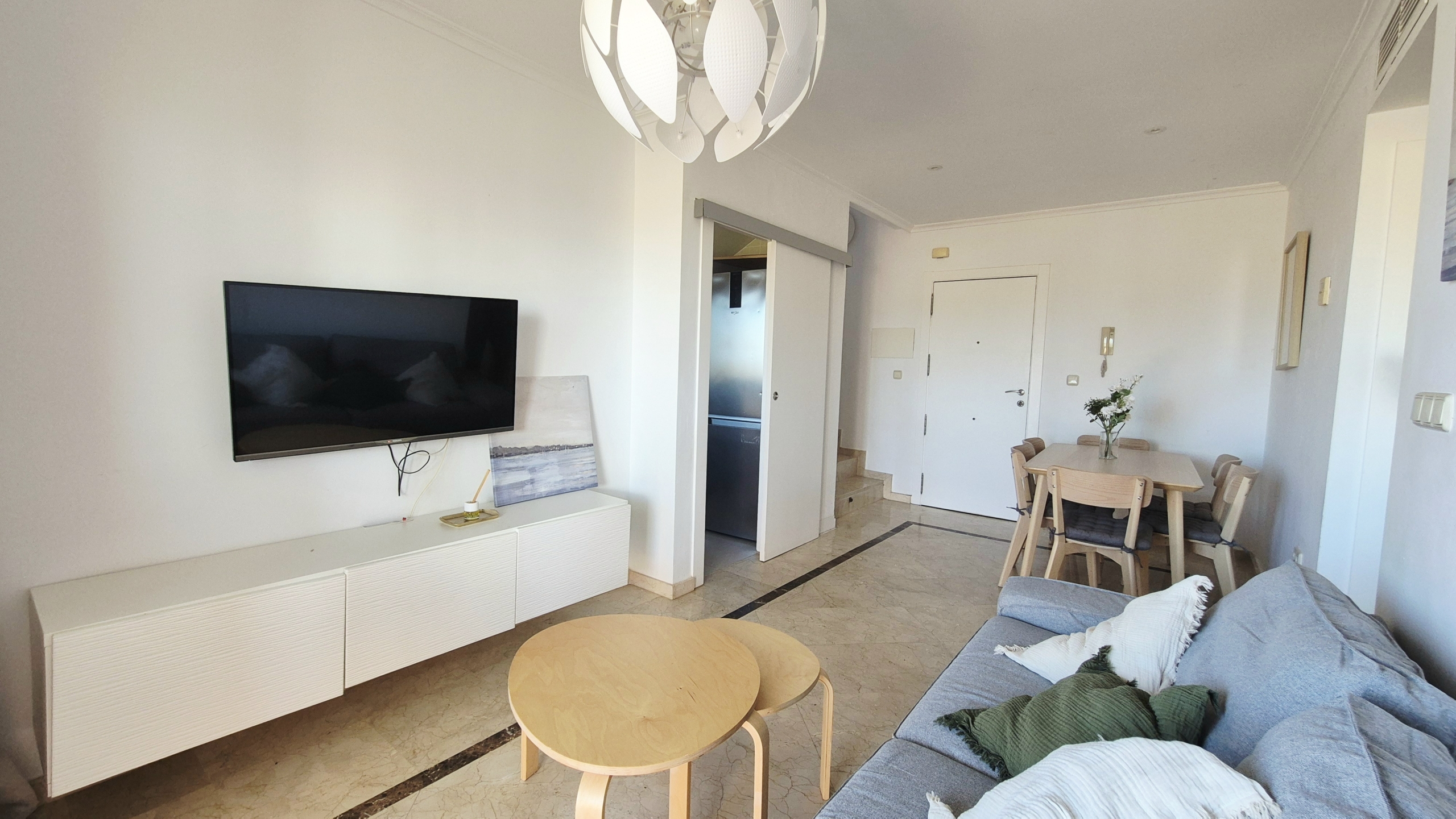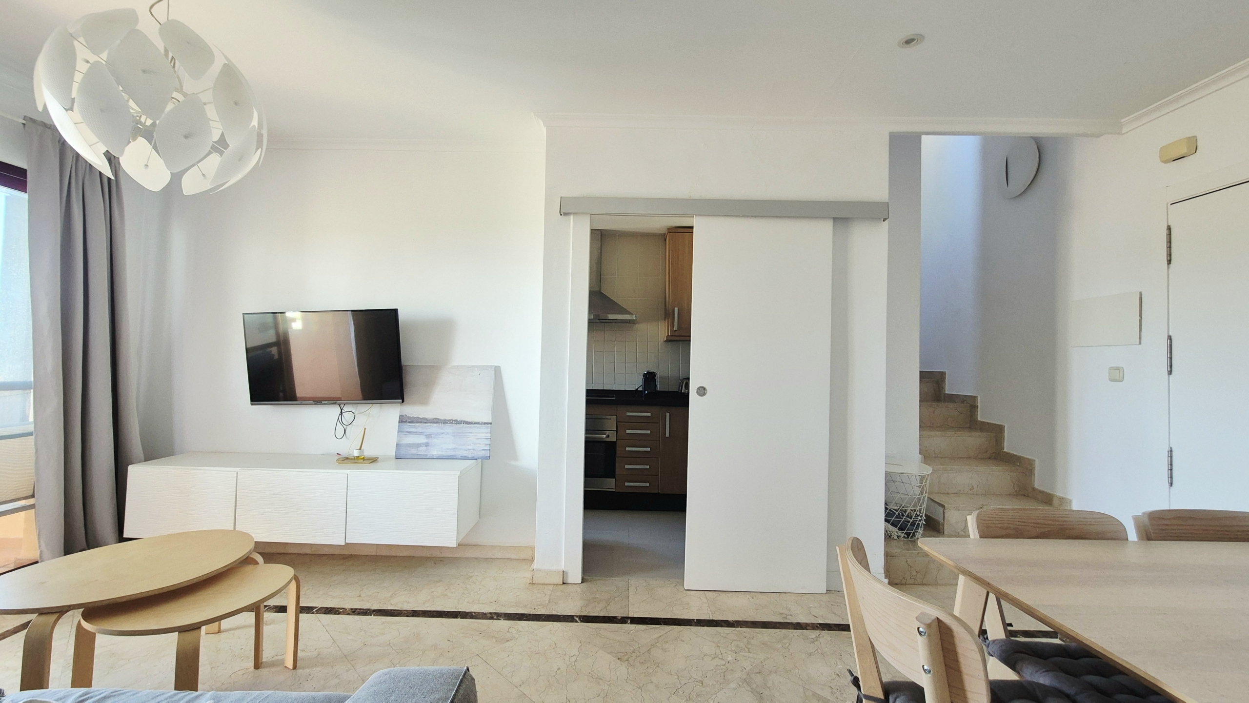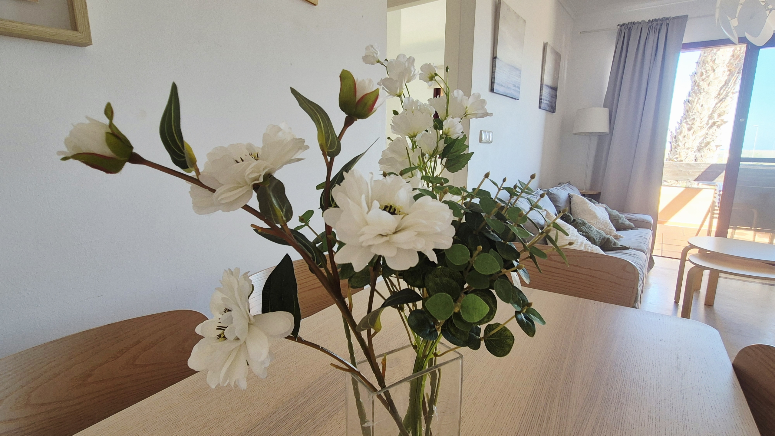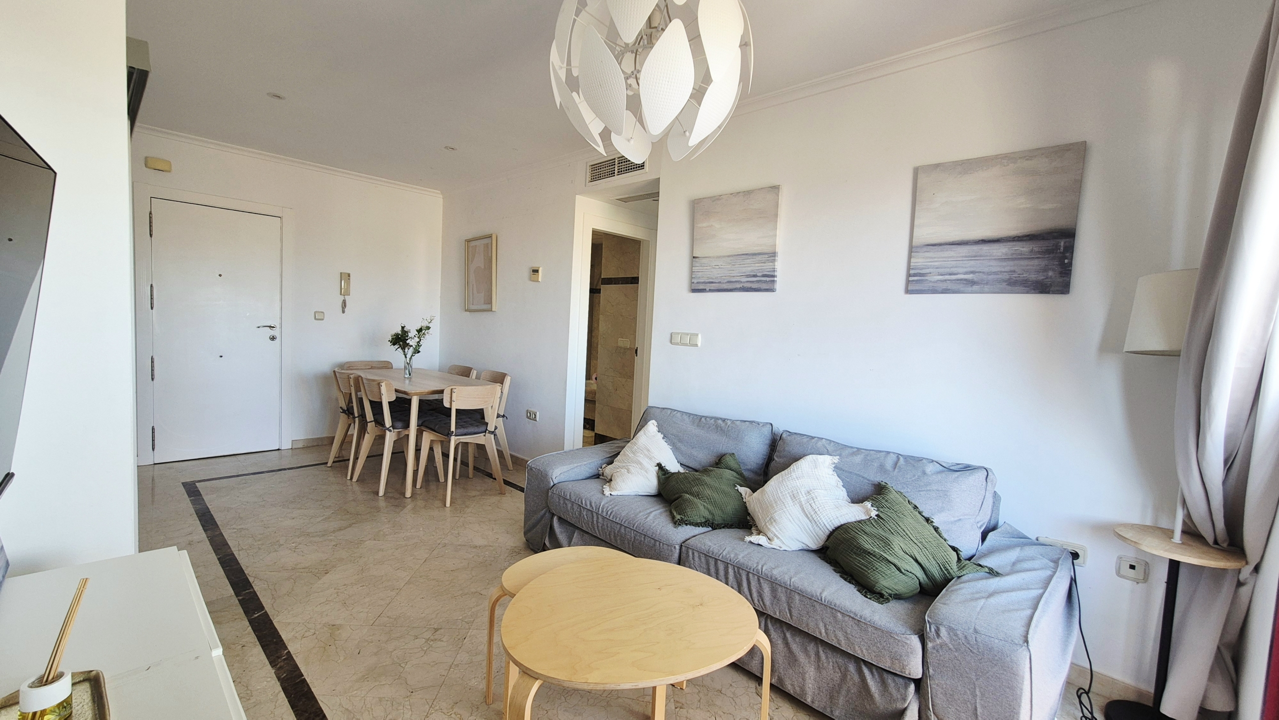 Amplio y muy luminoso salón-comedor con salida directa a un gran balcón con vistas al mar, perfecto para desayunar, relajarse o disfrutar de las noches de verano con la brisa marina.