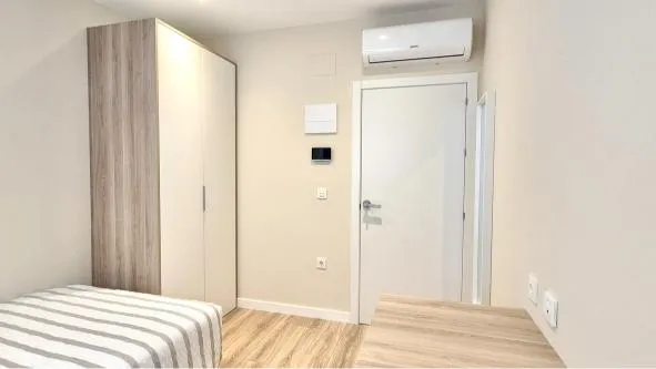 Esta habitación privada destaca por su luminosidad, gracias a su ventana exterior que da a la fachada. Está equipada con una cama de 1,20m con colchón nuevo a estrenar, aire acondicionado, escritorio, interfono para abrir la puerta principal o comunicarte con otras habitaciones, y un armario amplio. El acceso a la habitación se realiza mediante código personalizado, lo que garantiza privacidad y seguridad.